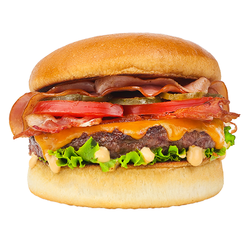 Buci, szmöre szósz, saláta, marha húspogácsa, cheedar sajt, lilahagyma lekvár, burgundi sonka, bacon, narancsos BBQ, paradicsom, csemege uborka.